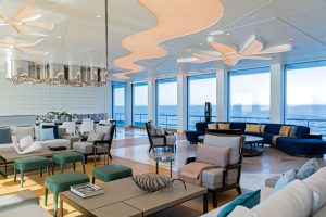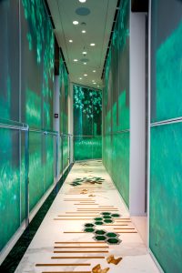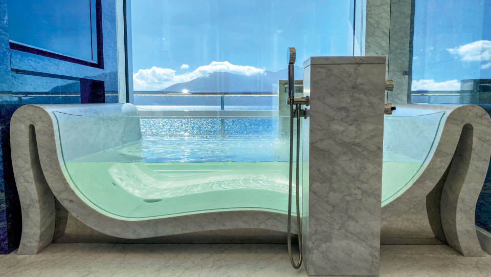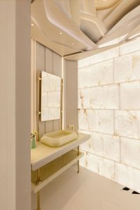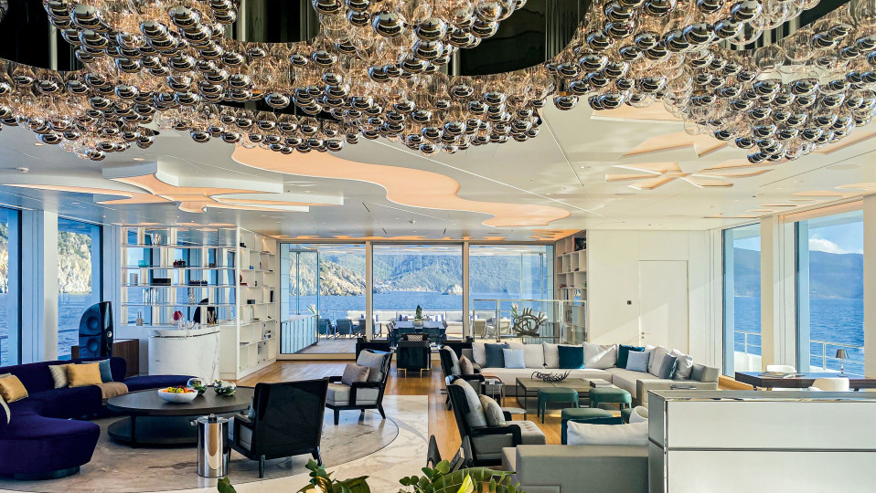 Inside, the yacht embraces art in every detail, paying tribute to renowned artists like Damien Hirst, Man Ray, and Matisse. The Main Deck Lobby showcases colored circles reminiscent of Hirst’s work, while Man Ray’s eye-shaped construction and Matisse-inspired backlit ceiling cut-outs add a unique artistic touch. A striking digital art display along the main staircase spans 370.00 m, where interactive projections of swaying forests and blooming magnolia flowers respond to guests’ movements. The VIP suite on the Upper Deck further enhances the experience with an onyx sculpture that replicates the changing phases of the moon, casting a dreamy glow throughout the space.